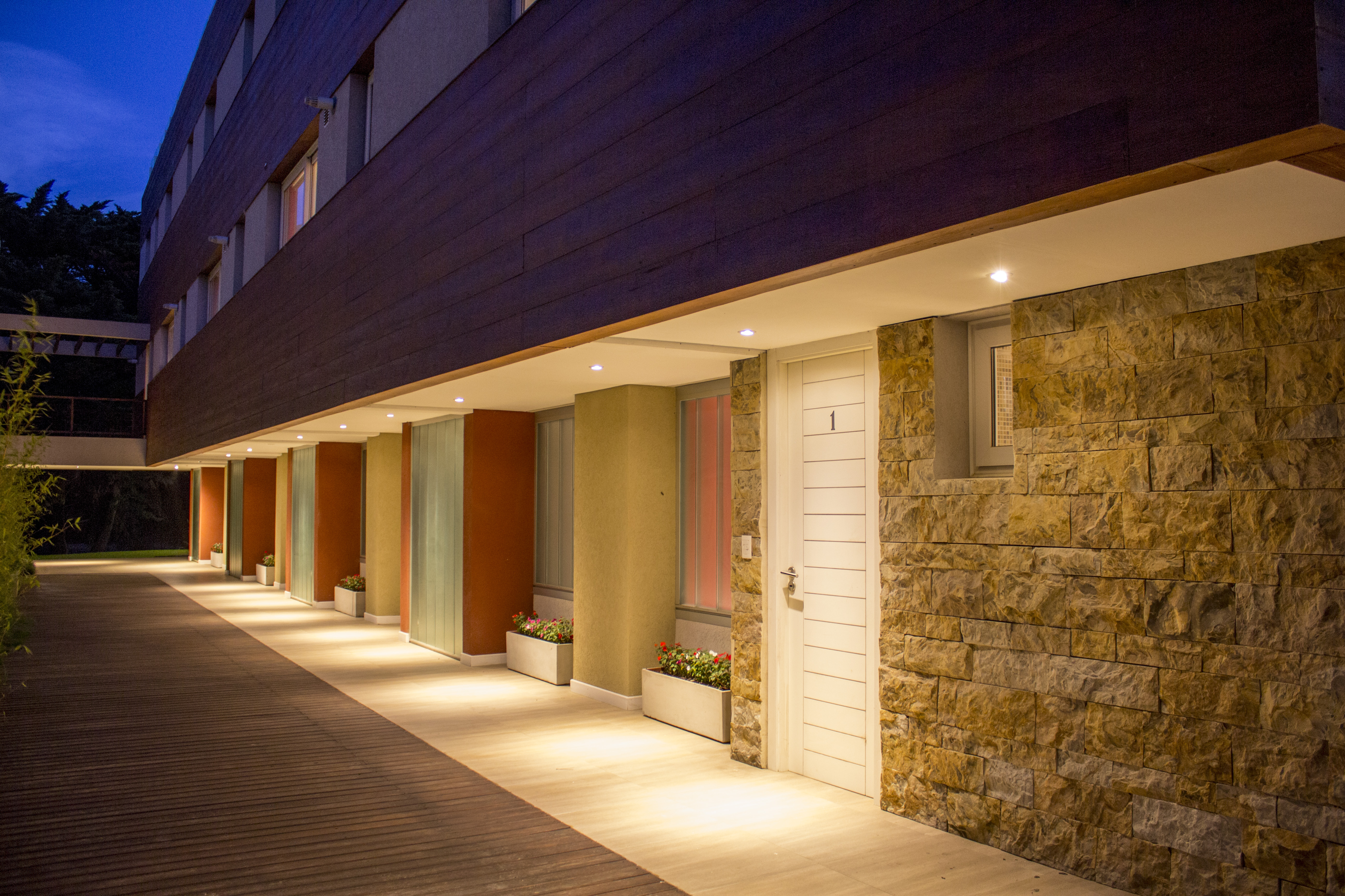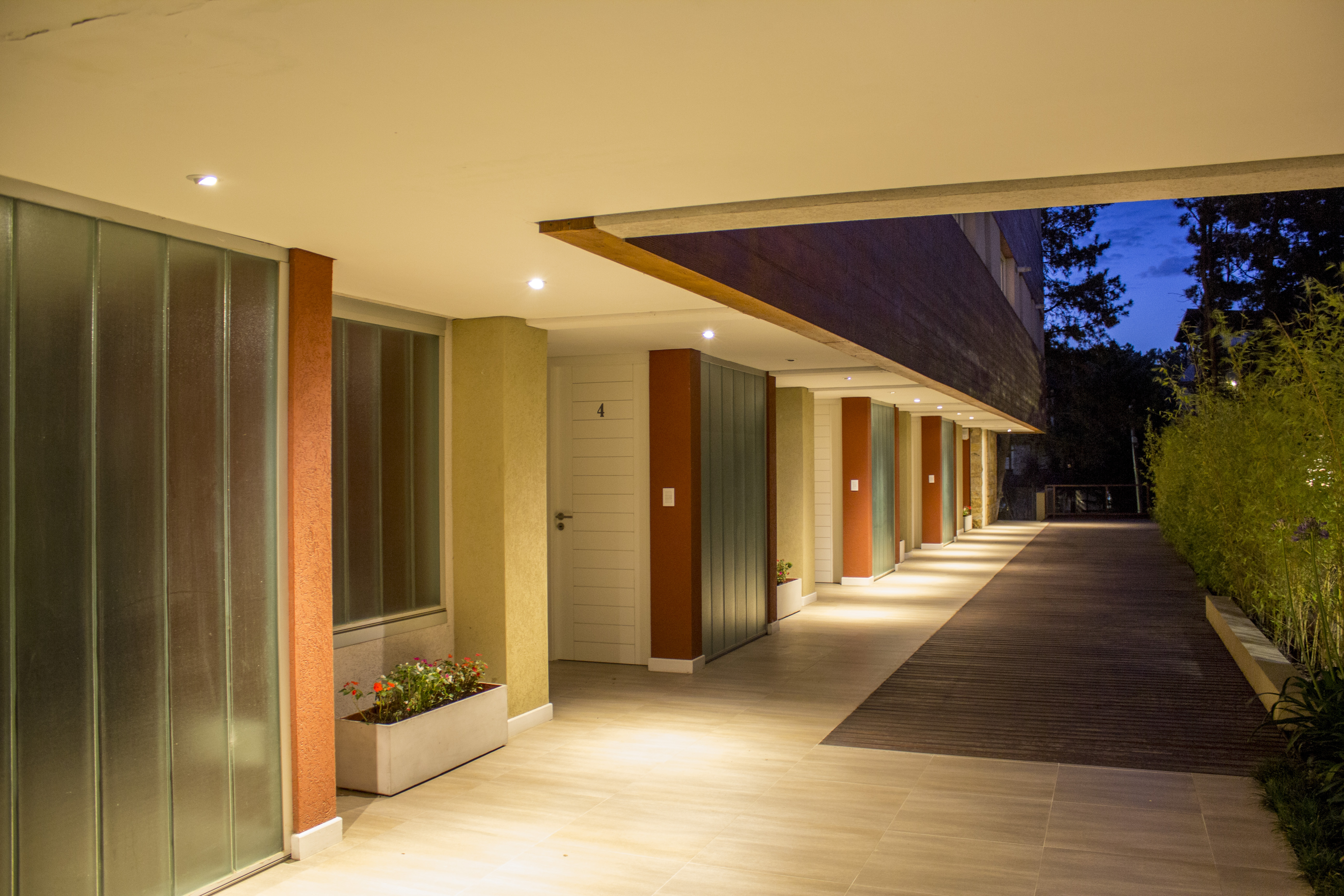 Vista nocturna lateral, unidades y estacionamiento exterior